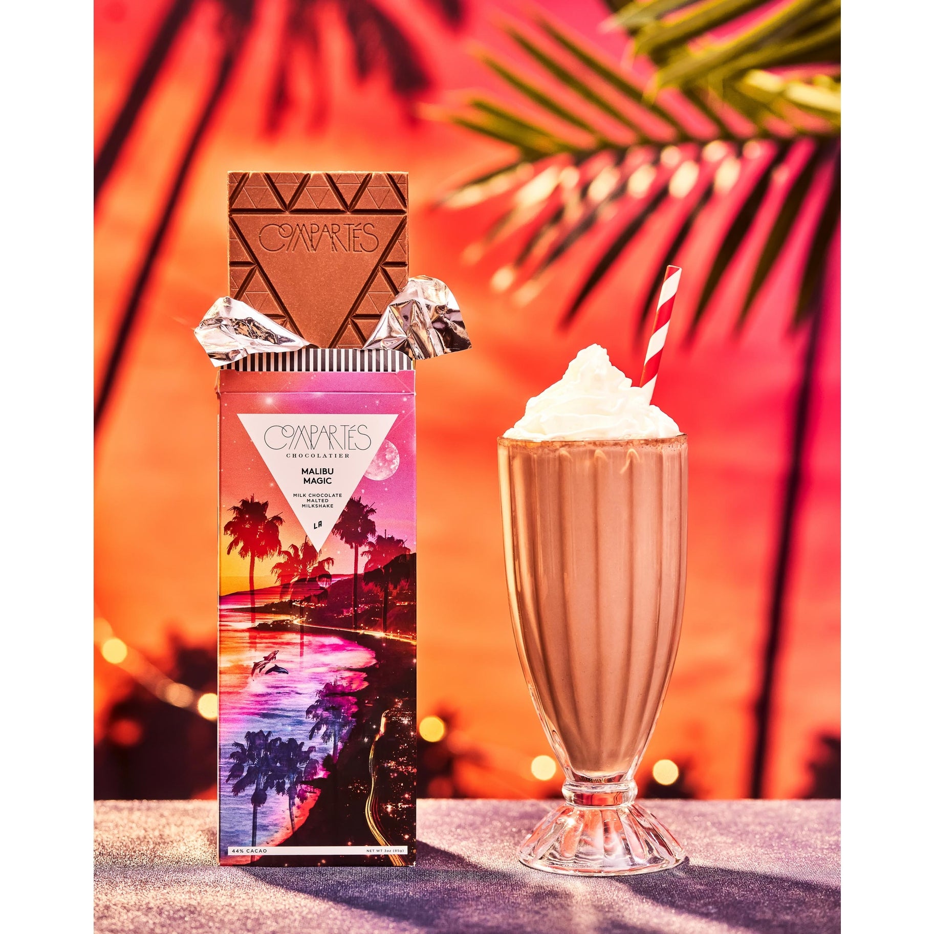 Brand NEW Compartés Gourmet MALIBU MAGIC Chocolate bar is a delicious malted milk chocolate sensation. Like drinking an ice cold milkshake on a warm Malibu night, this bear encompasses all things LA with its gorgeous striking design, dolphins in the ocean and warm vibes. Infused with tons of malted milkshake goodness and flecks of sea salt, this bar is bound to be a best selling hit!