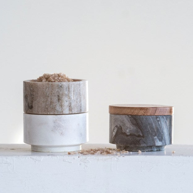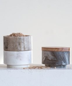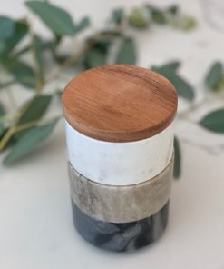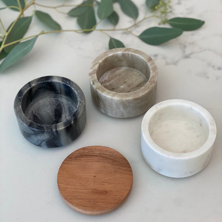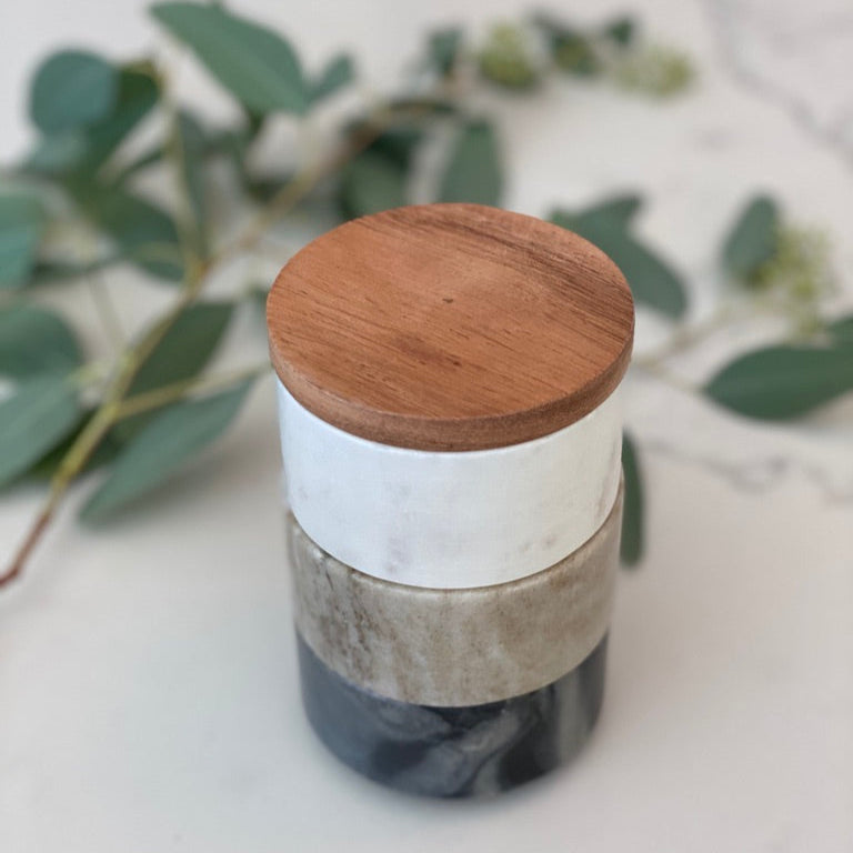 These marble stacking pinch pots with acacia wood lid come in handy for spices, salt, pepper and more.