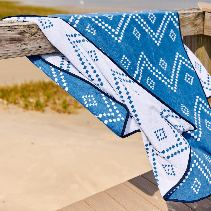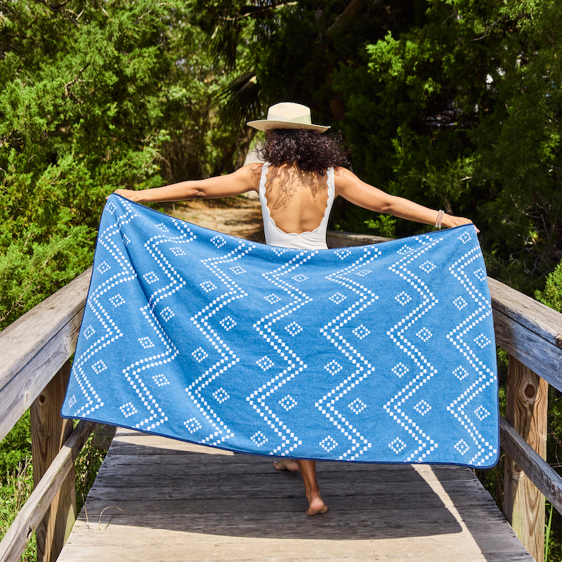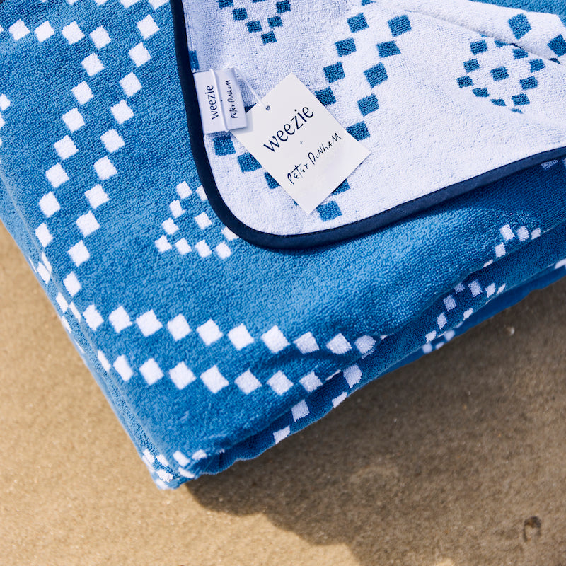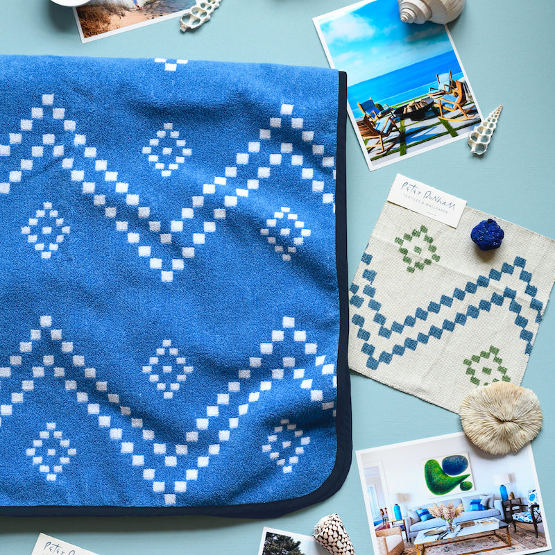 Our founder Peter Dunham teamed up with towel gurus Weezie for a limited edition collection of beach towels available for Summer 2022. Bringing together Peter’s iconic textile patterns and Weezie’s luxe terry, the designs are inspired by adventure both at home and abroad. Each towel has contrast piping for a chic finishing touch, and is reversible for fun color play. Available in Fig Leaf, Taj (shown), and Kashmir Paisley.